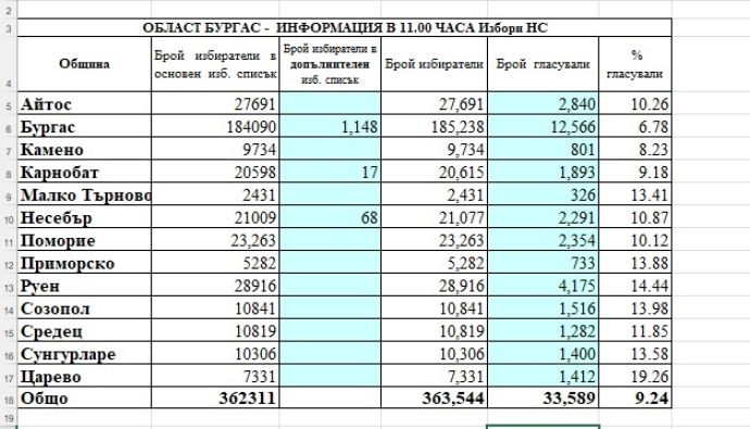 Избирателната активност в Бургаски регион към 11 часа е 9,24%, сочат данните на Районната избирателна комисия (РИК). Своя вот за подали 33 589 души от имащите право на глас.