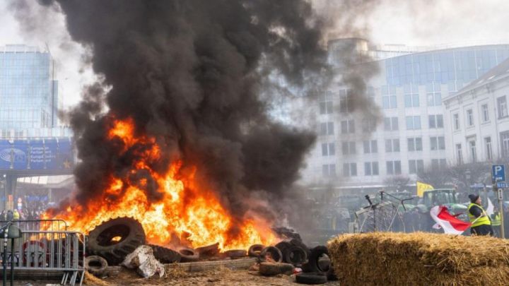 Бурни сцени се разиграха пред Европейския парламент, където фермери запалиха гуми и сено и замеряха полицията с грудки, а органите на реда отвърнаха със сълзотворен газ, като черен дим изпълни околните улици.