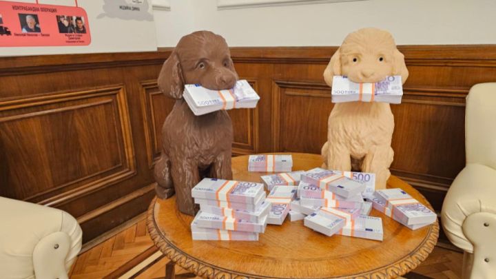 Пудели с пачки и турско кафе с картонени фигури на бившите министър-председатели акад. Николай Денков и Кирил Петков, бившият председател на "Да, България" Христо Иванов, както и бившият финансов министър и настоящ лидер на "Продължаваме промяната" Асен Василев.
