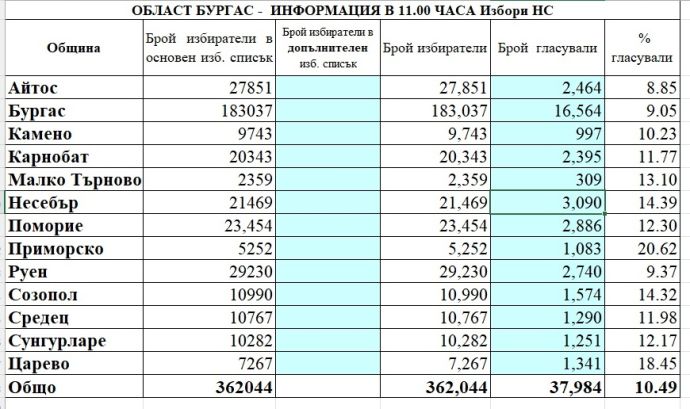 10,49% е активността в Бургаски регион към 11 часа, сочат данните на Районната избирателна активност (РИК). Най-много са гласувалите в Приморско – 20,62% и в Царево – 18,45%. Най-пасивни са имащите право на глас в Айтос-8,85%. Прави впечатление, че на тези парламентарни избори в Руен активността към този час е сред най-ниските – 9,37%.![]()