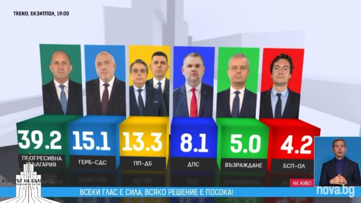 Формацията на Румен Радев "Прогресивна България" пренареди силите на тези предсрочни парламентарни избори и повежда с 39.2% - това сочат резултатите от exit poll-а на социологическа агенция „Тренд” към 19.00 ч., поръчан и финансиран от NOVA. На второ място остават досегашните лидери от ГЕРБ-СДС с 15.1% Трети са ПП-ДБ с 13.3%. Четвърти - "ДПС-Ново начало" с 8.1%. Партия "Възраждане" към момента са с 5%, БСП-ОЛ - 4.2%.