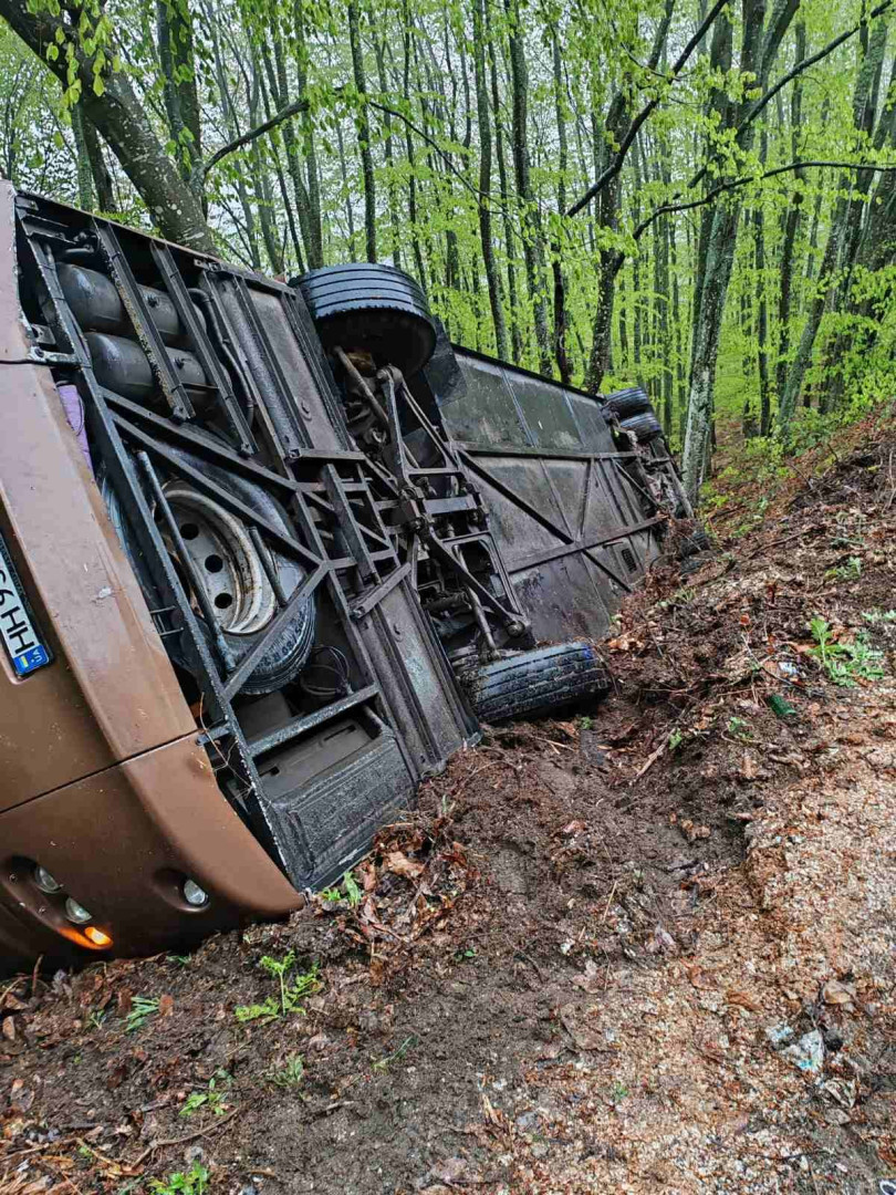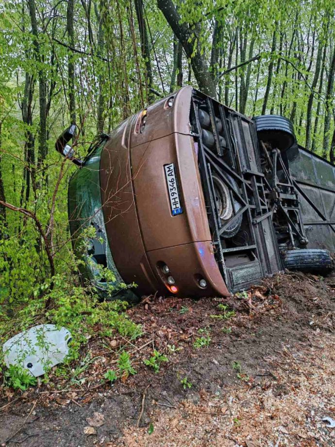 Сигналът за тежкия самостоятелен пътен инцидент с обърнат украински автобус на пътя Бургас- Малко Търново, непосредствено преди ГКПП М. Търново в посока Турция, е получен в полицията в 7,05 часа днес. По списък в автобуса са били 37 пътници и двама шофьори / или общо 39 украински граждани/. Вследствие на катастрофата загинали двама пътници. Автобусът е в канавката и до този момент са извадени всички пътници и водачите. Засега шест души са транспортирани към здравни заведения в Бургас, а десет души са откарани в центъра на "Бърза помощ" в М.Търново.