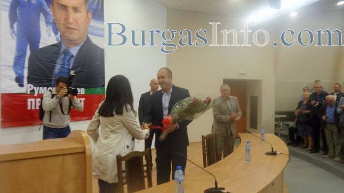 Повече от два часа продължи срещата на кандидата за президент със симпатизанти в аулата в сградата на БСУ. Залата го посрещна със скандирания „Победа“ и „Само напред“. Десетки симпатизанти ентусиазирано го посрещнаха, а той им отговори, че пътят е „Само нагоре“, използвайки военната си школовка. „Когато си излетял посреднощ и си дълбоко над Черно море и няма никаква светлина, тогава виждаш на връщане една малка точка светлина. Това беше Бургас“, каза емоционално Радев пред хората. Той заяви, че по време на кампанията водещата светлина за него няма да са платформите и партийните обещания, а волята на българските граждани.