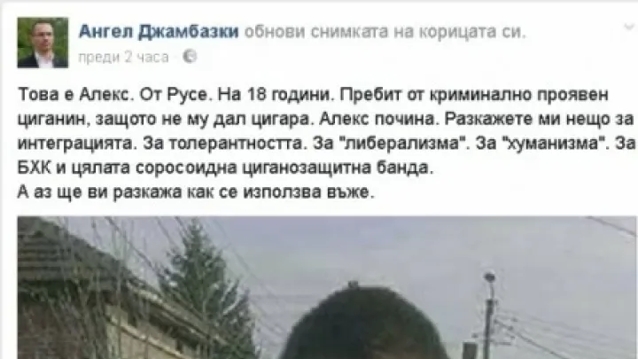 Евродепутатът от ВМРО Ангел Джамбазки излезе с гневен коментар във Фейсбук, след като научи, че Алекс, който бе пребит от цигани в Бяла, е починал. Ето какво написа той: "Това е Алекс. От Русе. На 18 години. Пребит от криминално проявен циганин, защото не му дал цигара. Алекс почина. Разкажете ми нещо за интеграцията. За толерантността. За "либерализма". За "хуманизма". За БХК и цялата соросоидна циганозащитна банда. А аз ще ви разкажа как се използва въже."