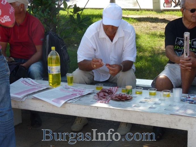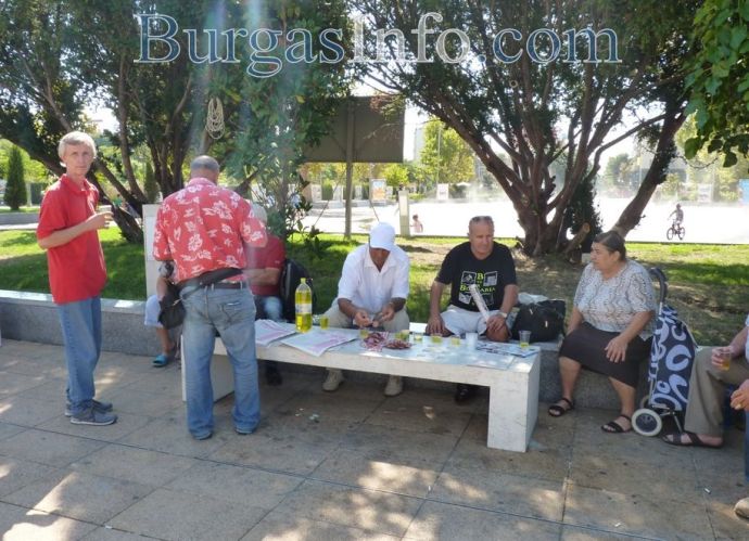Пенсионерите с радост подават чашите лимонада, наредени по декоративните дупки на пейките, както и резенчетата шпеков салам. А докато няма с кого да си говорят разгръщат страниците на вестника „Работническо дело”.