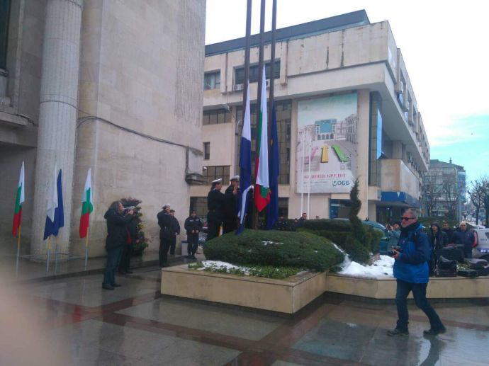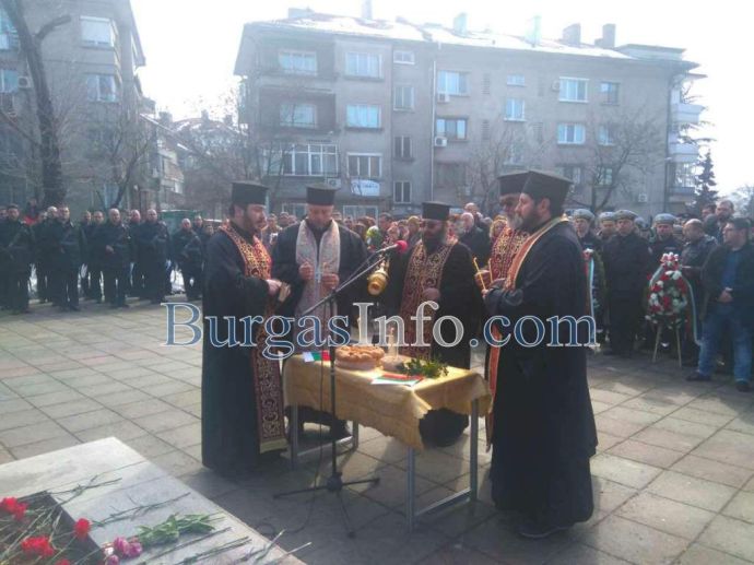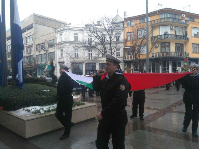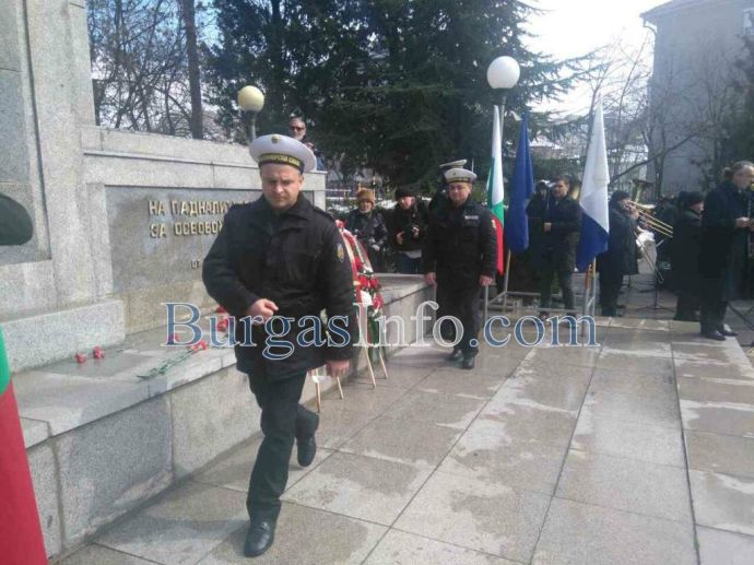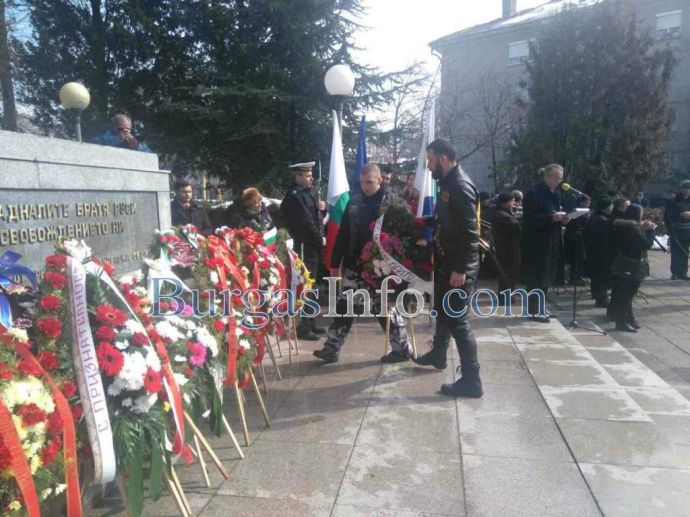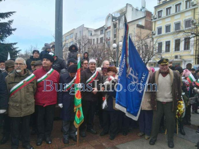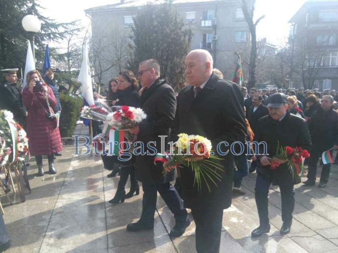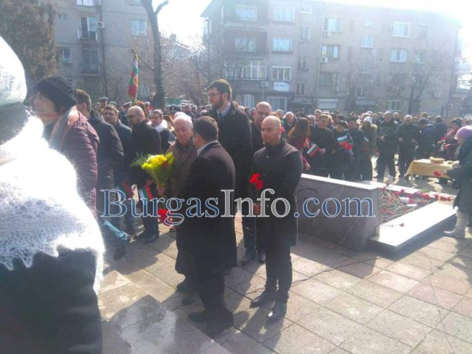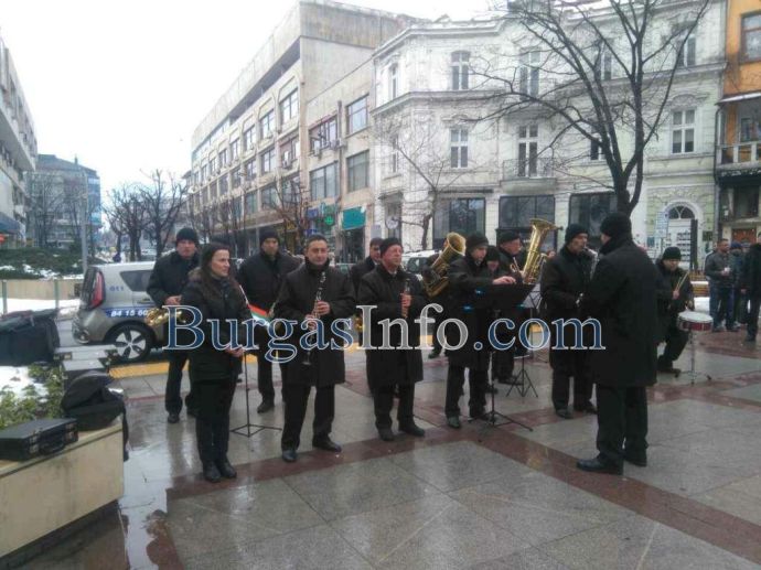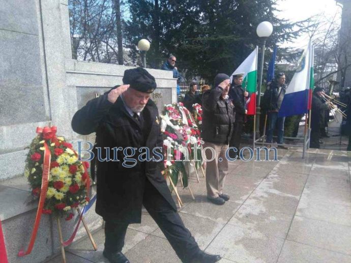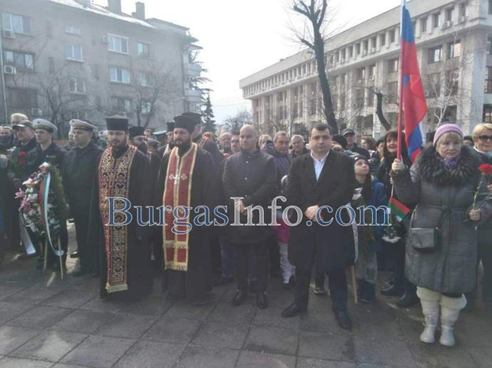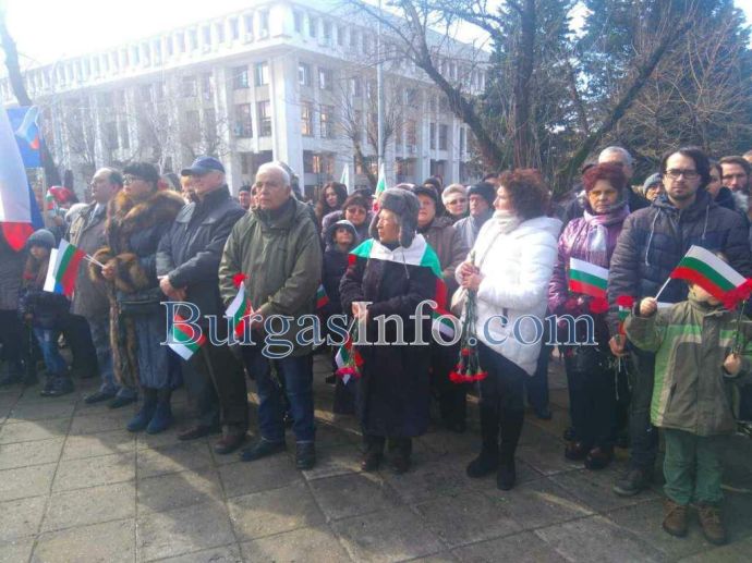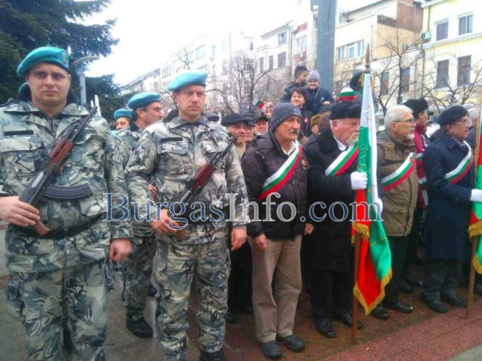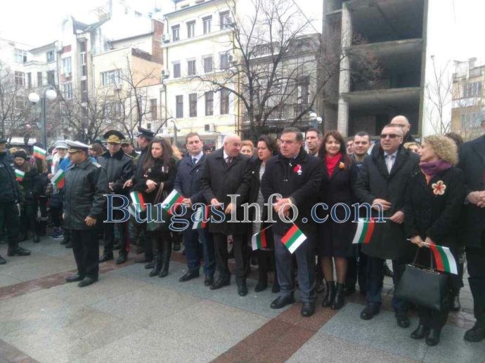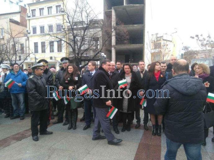 Лошото време не стресна бургазлии да изпълнят площад „Атанас Сиреков” с цветовете на националния трибагреник. Стотици знамена грейнаха пред Общината по време на ритуала по издигане на флага на Република България. В честванията на 3-ти март участват Бургаски градски духов оркестър и военнослужещи от Гарнизон Бургас.