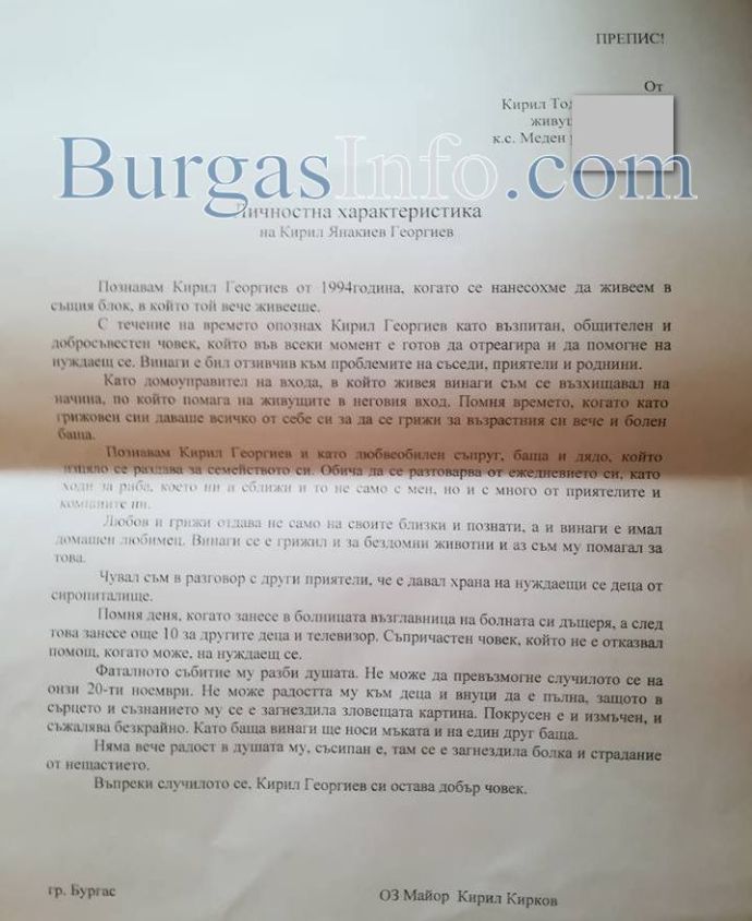 Бургаският окръжен съд осъди на 4 години ефективно, при първоначален общ режим в затвор, Кирил Георгиев. Днес той ексклузивно разговаря с екип на БургасИНФО за тежката съдба на втората страна в една огромна трагедия, в която има един погубен млад живот, почернено семейство, но и още един съсипан човек, както и друго страдащо семейство. Едно е сигурно – Кирил Георгиев изпитва огромно чувство за вина, той не се смята за жертва на обстоятелствата, а изстрадва смъртта на детето и болката на семейството му с цялата си тежест, сочат психолози.