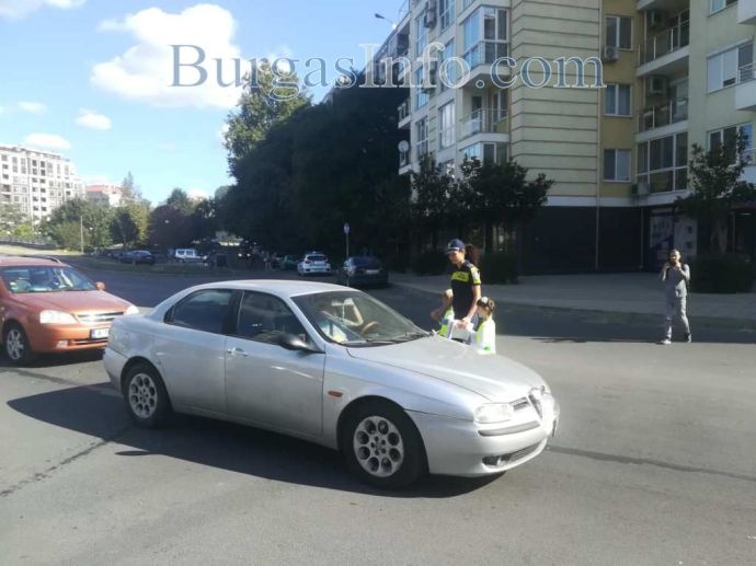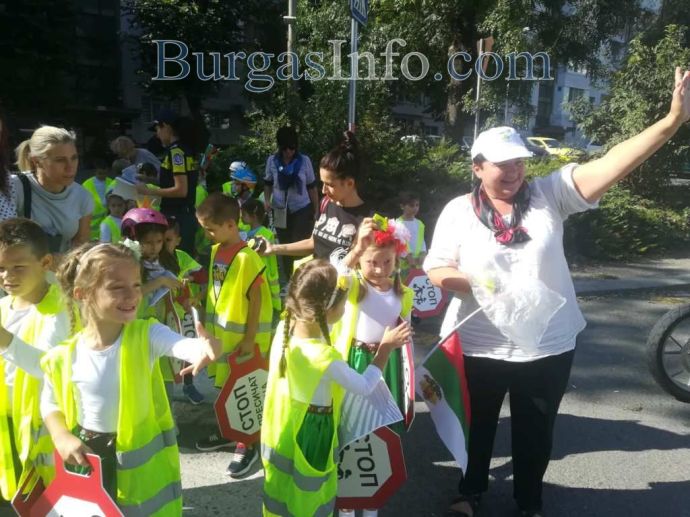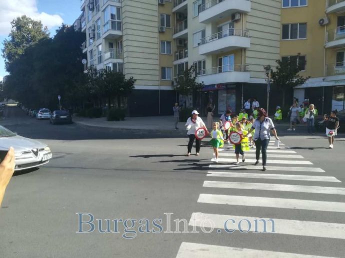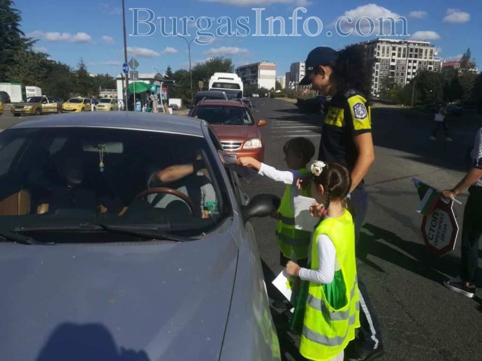 Екипи на КАТ спираха движението, а шестгодишните деца раздаваха на водачите брошури във връзка с безопасността на пътя. На мято беше и началникът на „Охранителна полиция” ком. Неделчо Рачев, както и говорителят на ОДМВР Бургас Цветелина Рандева – инспектор по превенция.