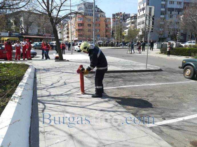 Пожарни буквално летят по улиците на Бургас с включени сирени, към новия блок 166 в ж.к. „Лазур”. Не изпадайте в паника, пожарът е част от проверка на реакциите на бургаските огнеборци. Пред сградата са екипи на полицията и на БЧК, които са партньори в провежданото учение.