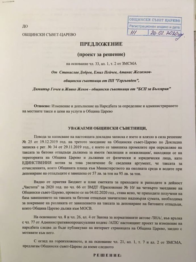 Опозицията в Общинския съвет в Царево внесе предложение да бъде намалена таксата смет за 2020 година. Мотивите са, че завишението, прието в края на миналата година, надвишава с 520 хил. лева сумата, която е необходима на Община Царево да плаща за депониране на отпадъците. Докладната записка по този повод е от името на общинските съветници Емил Пейчев, Станислав Добрев и Атанас Желязков от движение „Гергьовден“, както и от Димитър Гочев и Живко Жеков от БСП.