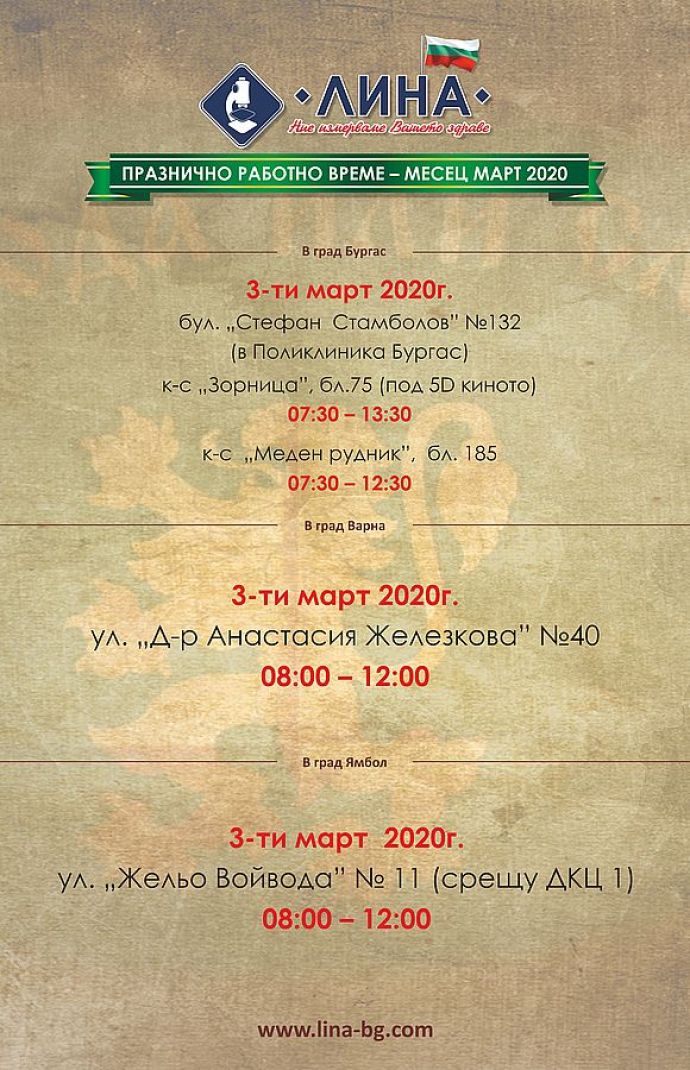 Mедицинска лаборатория „ЛИНА” обявява кои нейни филиали ще са дежурни на националния празник 3-ти март. На всички останали дати лабораториите ще работят по обичайния график.