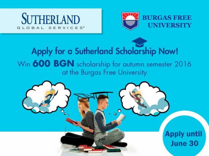 Още само няколко дни студентите на Бургаски свободен университет имат уникалния шанс да спечелят семестриална стипендия от 600 лв. Тя се предоставя от компанията „Съдърланд Глобъл Сървисиз” - най-големият работодател в областта на аутсорсинг услугите в Бургас.