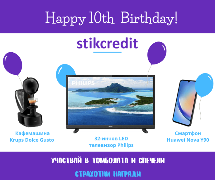 Този месец Стик Кредит празнува своята 10-годишнина от създаването си и искаме да поканим всички свои клиенти да празнуват заедно с нас участвайки с томболата с награди. Всеки клиент, който изтегли бърз кредит до заплата или кредит на вноски, ще участва в нашата томбола с много награди. Не пропускайте шанса си да изтеглите кредит между 01.07 и 31.07 и се включете в голямата надпревара.
