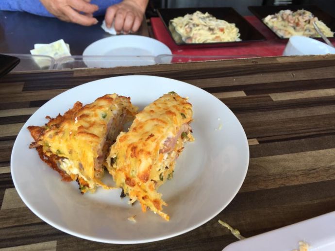 Почиствате и настъргвате катофите и морковите. Разбивате яйцата и смесвате с настърганите зеленчуци. Лука се нарязва и добавя към общата смес. Така обърканите продукти се разстилат върху кухненска хартия и се запичат за 30 мин. на 180 градуса. След изваждане от фурната полученият "блат" се намазва с топеното сирене с билки. Върху сиренето се нареждат парчетата шунка и отново се покрива с още един пласт сирене, след което се навива на руло и отгоре се настъргва кашкавала. Запича се за още 10 мин във фурната. Сервира се със свежа салата и домати.