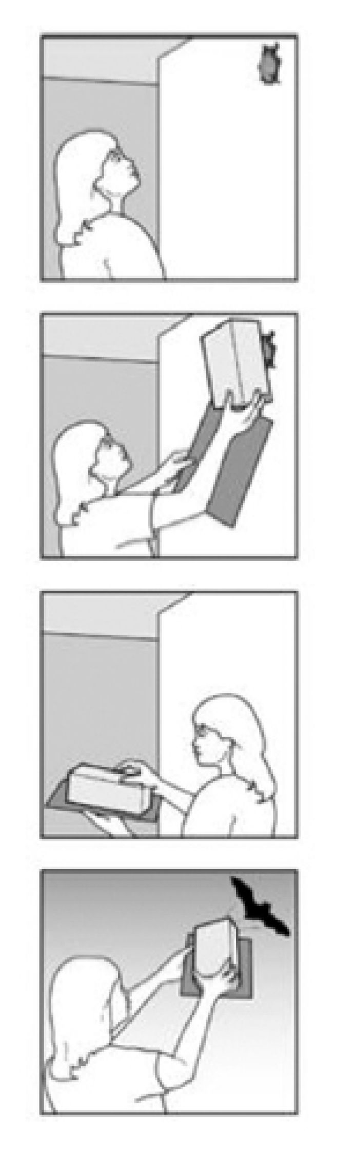 Ако прилепът не напусне дома ви сам, можете да го изчакате докато кацне на дадено място и да го покриете с малка кутия или други подръчни средства. Промушете парче картон между стената и кутията, приплъзнете прилепа в кутията и след това го пуснете навън. Можете също така да го хванете с ръка като ползвате кожени или работни ръкавици, които няма да позволят той да ви ухапе.