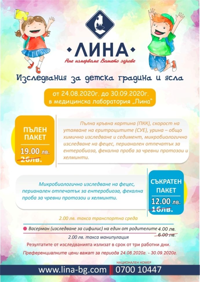 Медицинска лаборатория „ЛИНА” предлага изследванията, необходими за постъпване в детска градина или ясла, на преференциални цени в периода 24-ти август – 30-ти септември 2020 г.