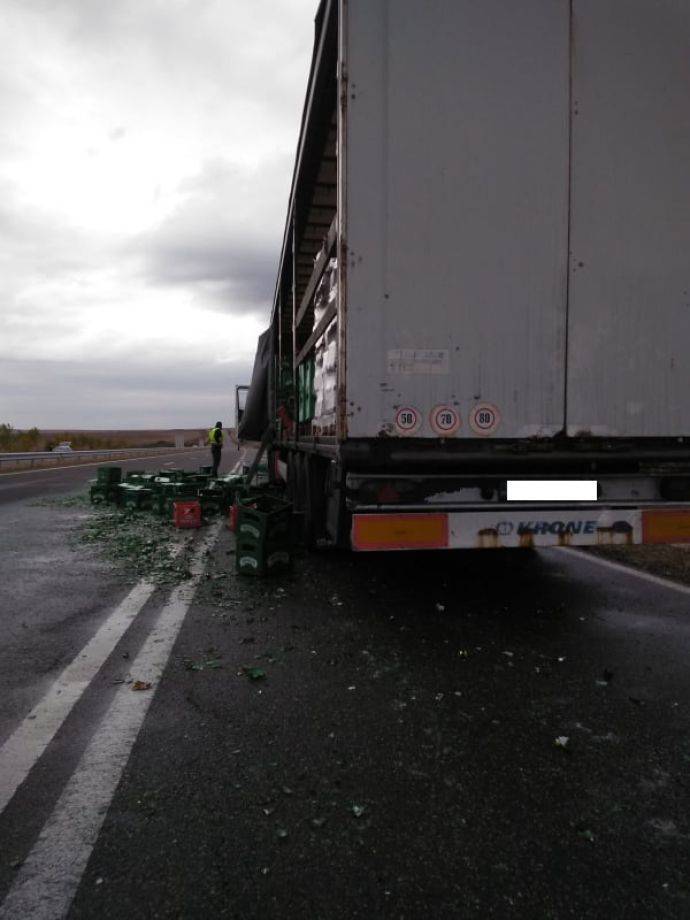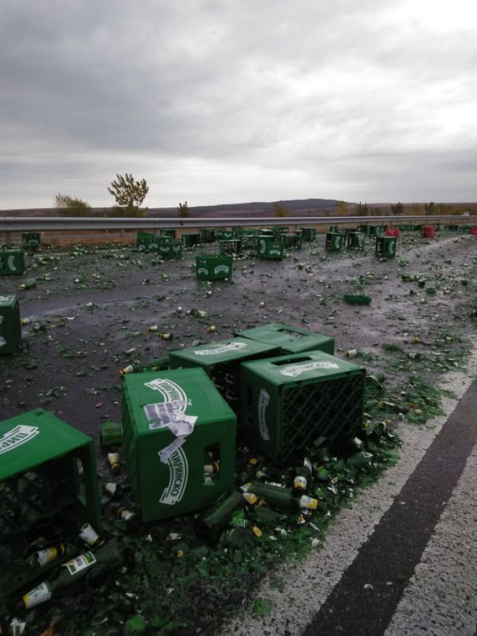На детелина на АМ Тракия в посока София - изход от Карнобат товарен автомобил - влекач с полуремарке е разсипал товара си каси с бира. В момента те са на пътното платно на автомагистралата. Към мястото е насочен екип на Пътна полиция, който ще затвори за движение автомагистрала “Тракия” в частта на инцидента, като пренасочи трафика през : детелината на “Тракия” вход Карнобат - западен обход - пътя Карнобат - Венец - Петолъчката.