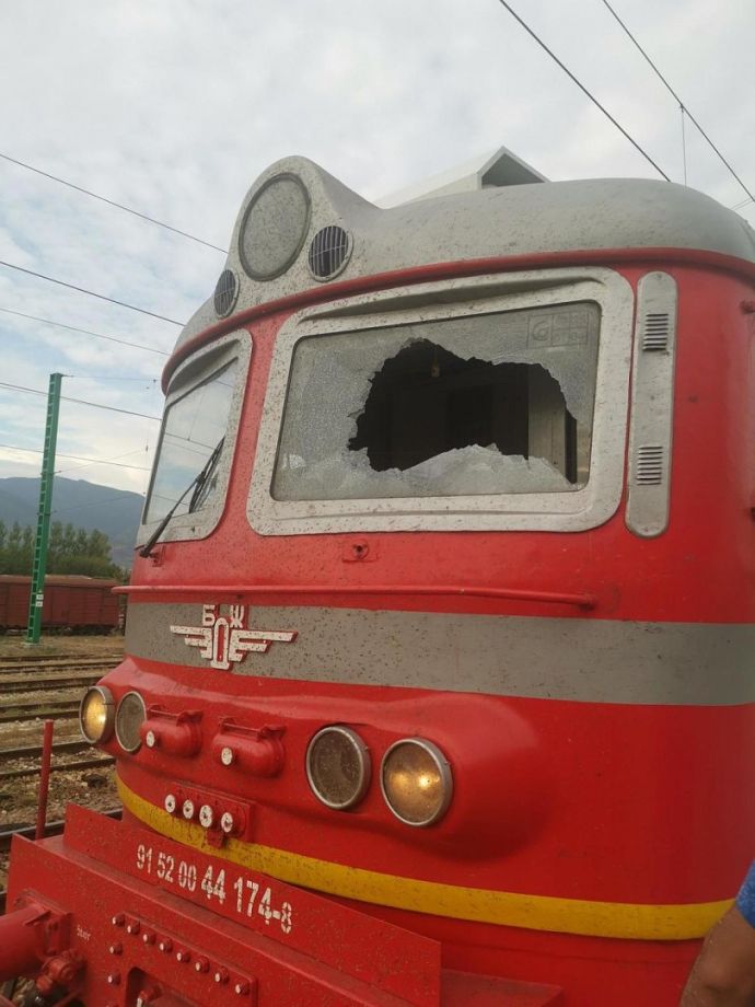 Бързият влак от София за Бургас престоя в гара Септември 62 минути заради счупено челно стъкло на кабината на локомотива, съобщават от БДЖ. При разминаване на композицията с влак от Стара Загора за София в участъка между Белово и Септември, от последния вагон на влака от Стара Загора е хвърлен предмет срещу насрещно преминаващия по другия път бърз влак за Бургас.