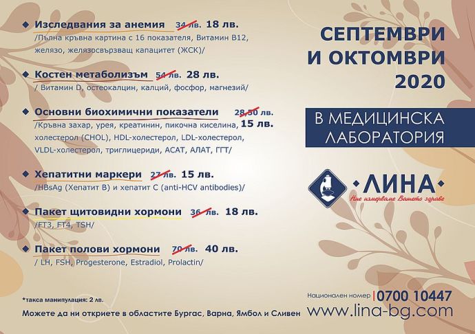 Медицинска лаборатория „ЛИНА” предлага шест профилактични кампании с изследвания на преференциални цени, подходящи за различните членове на семейството. Кампаниите важат до края на октомври в самостоятелните филиали на „ЛИНА” в областите Бургас, Варна, Сливен и Ямбол. За тях направление от лекар или предварително записване на час не са необходими. Таксата манипулация е 2 лв.