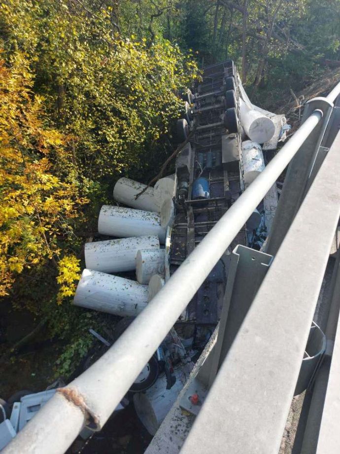 След падането шофьорът е успял да излезе от кабината и е без сериозни наранявания - пътят не е затворен за движение.