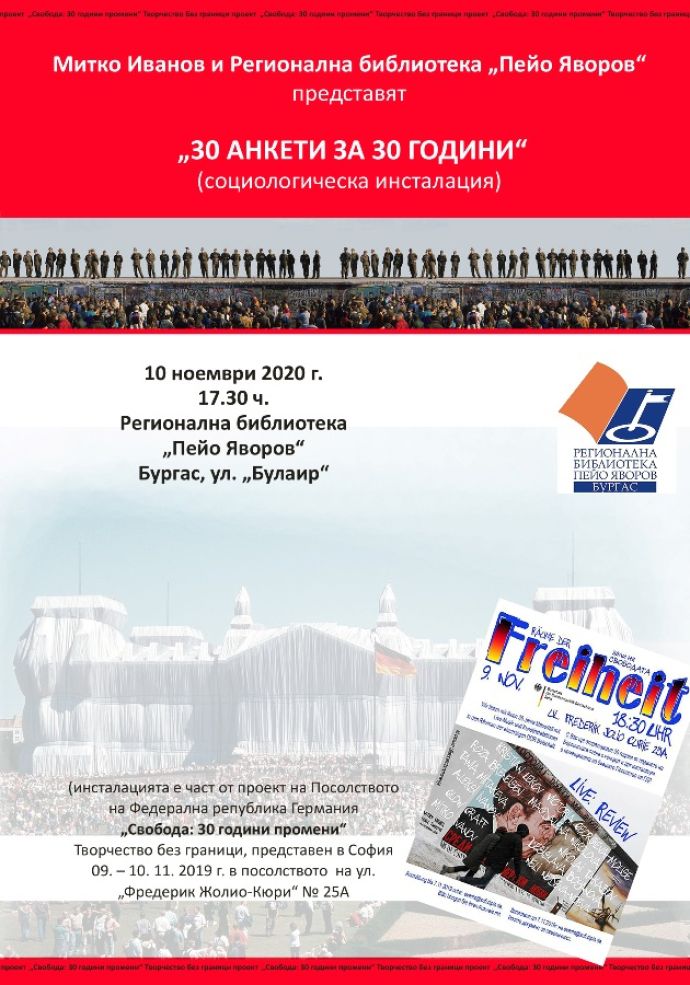 Изследователят Митко Иванов представя „Зо анкети за 30 години”. Проектът представлява социологическа инсталация и ще бъде презентиран на 10-и ноември, вторник, от 17,30 ч. в Регионална библиотека „П. Яворов“ в Бургас, ул. „Булаир“.
