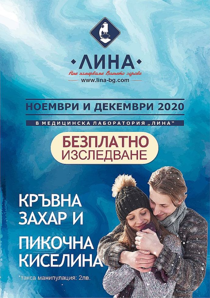На 14-ти ноември отбелязваме Световния ден за борба с диабета. Според статистиката в България с това заболяване към края на месец септември 2020 г. са регистрирани над 370 000 души. Голям процент от хората обаче не знаят, че имат диабет. Това го превръща в една от най-разпространените болести, за чието предотвратяване и контрол основно значение имат здравословния начин на живот и профилактика. Поради тази причина медицинска лаборатория „ЛИНА” предоставя възможност на пациентите, посетили я за изследвания, да измерят безплатно нивата си на кръвна захар. За да може да се включат повече хора, кампанията е с продължителност ноември и декември 2020 г. В нея е добавено и изследване на пикочна киселина.