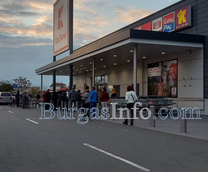 Поток от автомобили се стича към големите супермаркети в 16: 30 ч. в Бургас, когато пада забраната на хората под 65 години да пазаруват. Цели семейства са пред основните вериги - „Лидл”, „Кауфланд”, „Билла” и др. Най-нетърпеливите са пред входа, спазвайки дистанция, а другите чакат в автомобилите си настъпването на заветния час.