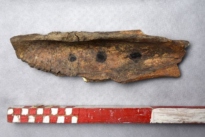 Традиционно при процеса на проучване се събира всяка открита животинска кост. При анализа им археозоолога д-р Георги Рибаров се натъква на изключително интересна находка. Това е плешка от кон, открита в пласт от края на XIII- началото на XIV в. Тя е била подложена на термична обработка – месото е изядено след печене, което добре се вижда от характерната промяна на цвета на костта. След това, върху едната повърхност на плешката на три места има ясни следи от горене. Почти сигурно е, че става въпрос за притискане на нагорещено желязо с кръгло сечение по повърхността на костта. По този начин са прогорени три кръга, на равно разстояние един от друг, в линия.