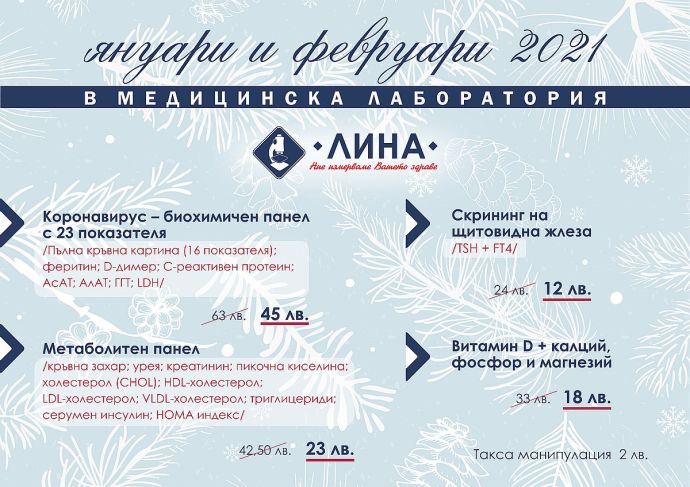 Mедицинска лаборатория „ЛИНА” обявява четири нови профилактични кампании през месеците януари и февруари 2021 г. Те важат в самостоятелните ѝ филиали в областите: Бургас, Варна, Ямбол и Сливен, като направление от лекар или предварително записване на час не са необходими. Таксата манипулация е 2 лв.