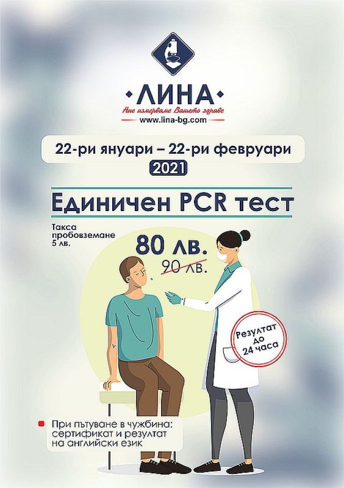 Медицинска лаборатория „ЛИНА” временно въвежда нова, по-ниска цена на единичния PCR тест за COVID-19. В периода 22-ри януари – 22-ри февруари 2021 г. тя ще бъде намалена от 90 лв. на 80 лв. Таксата пробовземане е 5 лв.
