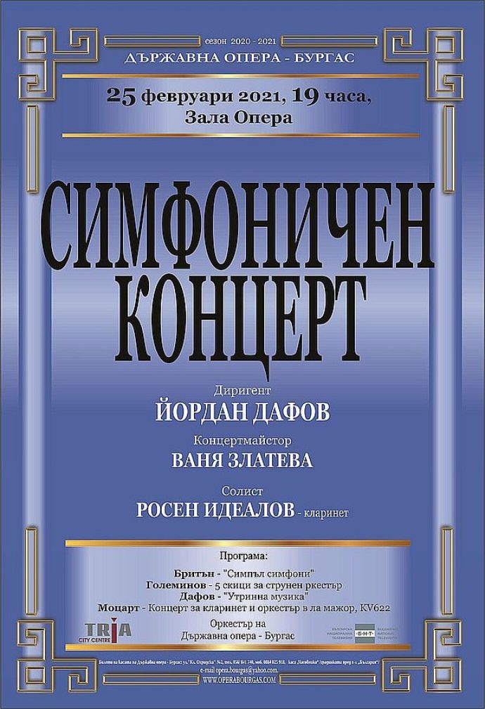 Солист на концерта утре е друг изтъкнат български музикант – кларинетистът Росен Идеалов, концертмайстор е Ваня Златева. В програмата на концерта са включени: „Симпъл симфони“ от английския композитор Бенджамин Бритън, творил през XX век. Музикалният материал, върху който е изградено произведението, е писан още в ранните години на композитора – пиеси за пиано, които той е творил между 9 и 12-годишна възраст. Партитурата на „Симпъл симфони“ е завършена, когато Бритън е бил едва на 20 години. Симфонията е написана за струнен оркестър или квартет и е изпълнена за първи път през 1934 г. Творбата е посветена на неговия учител по виола от детството му. „Симпъл симфони“е предпочитана репертоарна творба на световните оркестри, а и е радушно приета и от публиката, не само поради непретенциозното си заглавие /„проста“, „семпла“ симфония/, но и защото е грабваща с младежкия си дух и непосредственост.