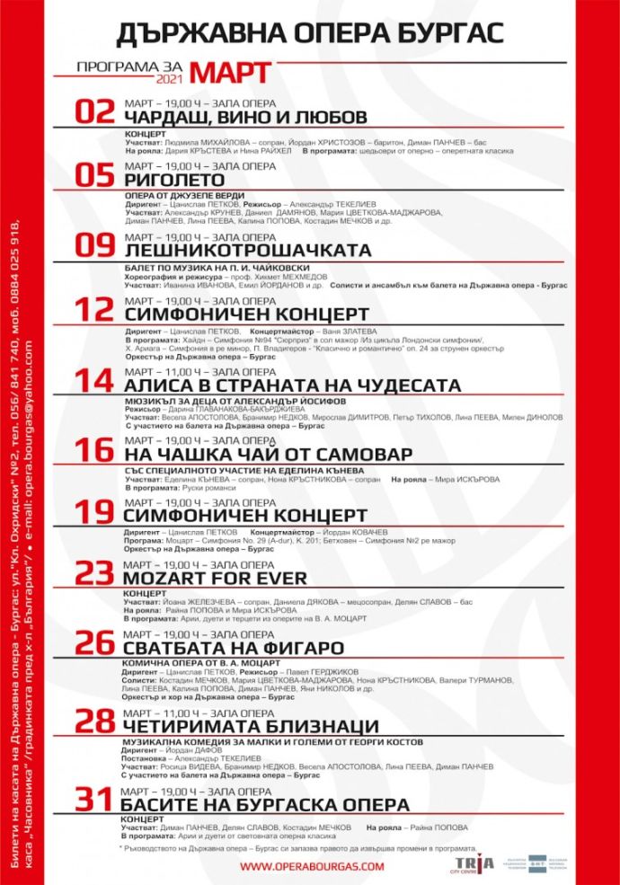 Програмата на Държавна опера – Бургас за м. март е разнообразна и ще предостави вълнуващи моменти на досег с музикално-сценичното изкуство на представители на всички сегменти от публиката – от най-малките до специалистите, занимаващи се професионално с музика, както и на по-широката аудитория с вкус.