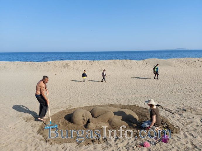 На ивицата двама пясъчни художници Пол и Реми Хогърд приготвяха нова изненада за минувачите. Мнозина се спираха, за да гледат, или да си направят селфи с бебето, което се роди като фигура на плажа.