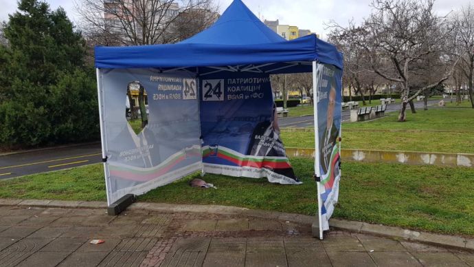 Вандалски акт е извършен тази нощ срещу предизборната шатра на Патриотична коалиция ВОЛЯ и НФСБ в парка на ЖК „Изгрев“ в Бургас. Шатрата е нарязана цялата. Активистите на коалицията, които са всеки ден пред нея, са заварили отвратителната гледка в 9.30 ч. тази сутрин. Още вчера обаче те са забелязали, че са правени опити тя да бъде съборена.