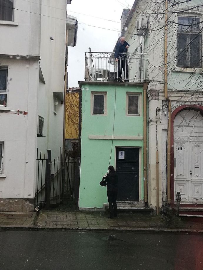 „Така се доставя храна от Домашен социален патронаж в ковид времена”, пишат от патронажа, които са качили на страницата си снимка как служителка връзва днешните порции за въженце, което възрастен мъж издърпва от терасата на къщата си в центъра на града.