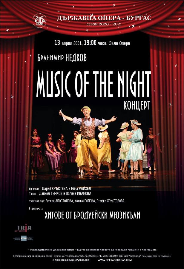 След музикалната комедия за малки и големи „Четиримата близнаци“ /на 11 април, в 11 часа, в Зала Опера/, в която солистът на Бургаската опера Бранимир Недков, баритон, изпълнява цели четири роли – на близнаци, всеки от които с различен характер и ценности, на 13 април, от 19.00 часа, също в залата на Операта, младият талантлив баритон ще представи една атрактивна концертна програма, обединена от надслова Music Of The Night. Посланието на концертния спектакъл е инспирирано от едноименното заглавие на прочутата песен от мюзикъла „Фантомът на операта“ от Андю Лойд Уебър.![]()