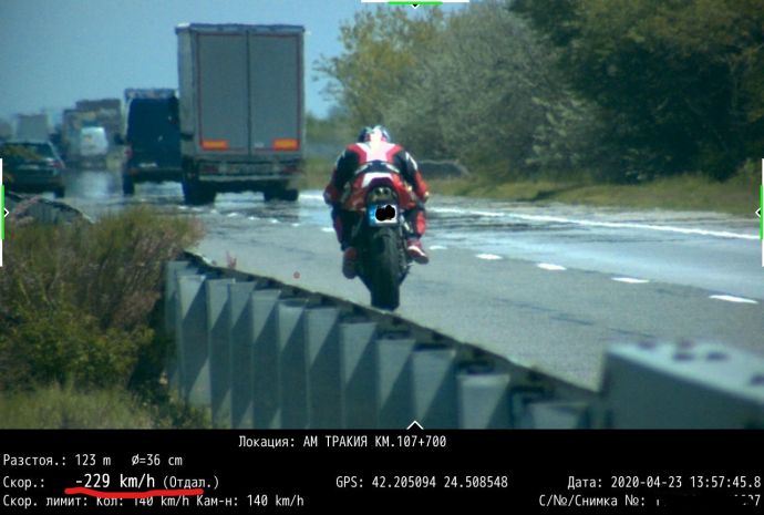 Моторист беше засечен да се движи с 229 км/ч на магистрала „Тракия”. Снимка на нарушението беше разпространена от МВР, съобщава Нова тв.