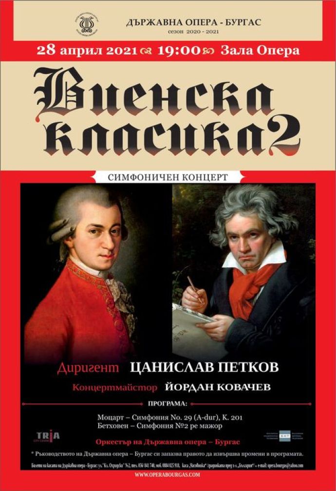 На 28-и април, петък, от 19 часа, в залата на Бургаската опера, за почитателите на класическата музика ще прозвучат произведения на Виенските класици Моцарт и Бетовен. Програмата на концерта „Виенска класика 2“ е обединена идейно в рамката на творците от Виенската класическа школа, носеща характерните черти на европейски стил, аристократично отношение към света и изискана музикална форма. Диригентът на оркестъра на Бургаската опера Цанислав Петков е подбрал за концерта Симфония №29 от Волфганг Амадеус Моцарт и Симфония №2 от Лудвиг ван Бетовен. Концертмайстор е Йордан Ковачев. Младият диригент съвсем наскоро дирижира оркестъра на Държавна опера – Бургас на симфоничния концерт на 16-и април, т. год. Първият концерт от цикъла „Виенска класика“ бе на 17-и септември 2020 г., под диригентството на Йордан Дафов. С концертната проява официално беше открит Сезон 2020/ 2021 на Бургаската опера.
