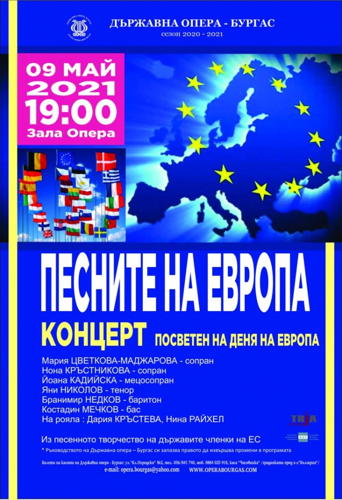 На 9 май, от 19 часа, също в залата на Операта, е концертът „Песните на Европа“, който е посветен на Деня на Европа. В него участват солисти на Бургаската опера, а репертоарът е подбран из разнообразното песенно творчество на държавите членки на Евросъюза. Участват: Мария Цветкова-Маджарова, Нона Кръстникова, Йоана Кадийска, Яни Николов, Бранимир Недков, Костадин Мечков. На рояла – Дария Кръстева и Нина Райхел. ![]()