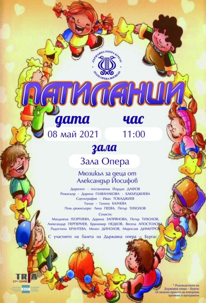 Непосредствено след великденските празници – на 8 май, от 11 часа, мюзикълът за деца от Александър Йосифов „Патиланци“ ще зарадва най-малките зрители. Веселите истории за Баба Цоцолана, Патиланчо и неговата знаменита компания, чрез музика и танци ще разкажат артистите: Магдалена Георгиева, Дарина Запрянова, Петър Тихолов, Александър Перпериев, Бранимир Недков, Весела Апостолова, Радостина Крантева, Милена Динолов и Мирослав Димитров. В забавната постановка, по режисура на Дарина Главанакова-Бакърджиева, помощник-режисьори – Лина Пеева и Петър Тихолов сценография на Иван Токаджиев /който сътвори невероятния декор на премиерния спектакъл на балета „Жизел“ наскоро/ и танци на Галина Калчева, участват и артисти от балетния състав на Бургаската опера. А за радост на децата – на сцената, като актьор, участва и истинско куче!![]()