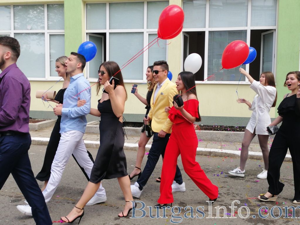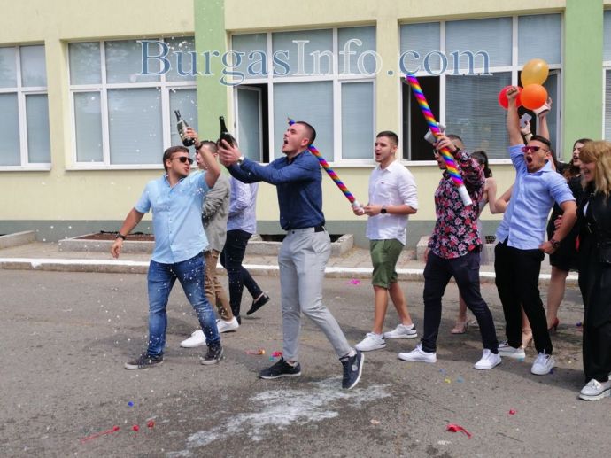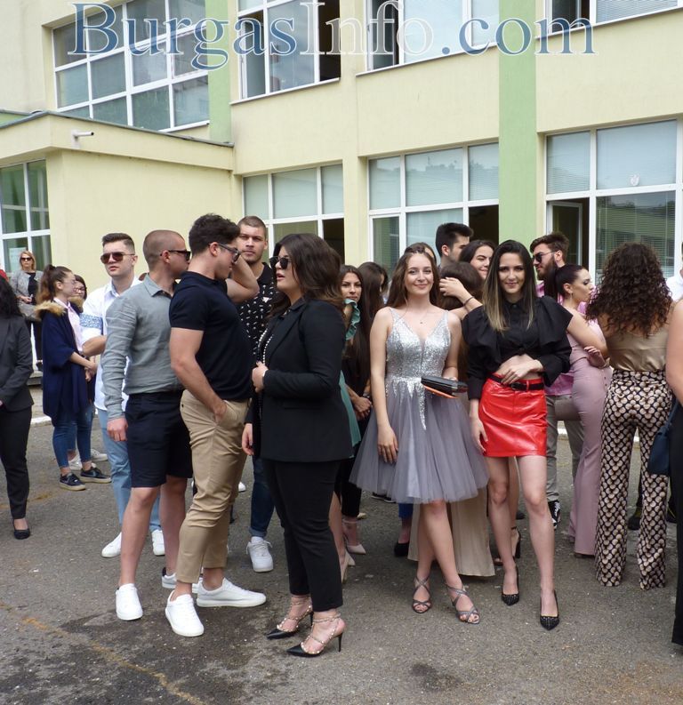 Абитуриентите показаха класа в аутфита си, което важеше и за момчетата. Те с радост обливаха всички около себе си с шампанско.