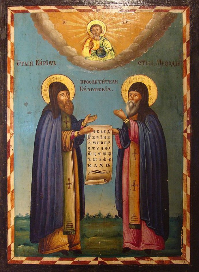 Такъв иконографски модел, представящ светите братя, обединени в една композиция със свитък с азбуката, като фронтиспис за първи път е показан в гравюра, поместена в „Български буквар“, издаден в Москва през 1844 г. От основните публикации за гравюрата е известно, че това е най-ранното произведение, познато до момента, където св. Кирил и св. Методий са показани заедно, държащи свитъка с азбуката. Илюстрацията е озаглавена „Българските книжници“. Дело е на Корнелий Яковлевич Тромонин. Той е автор на литографски албуми, въвежда многоцветния печат в Русия, поставяйки началото на хромолитографията.