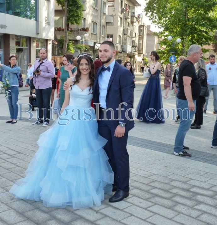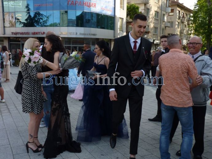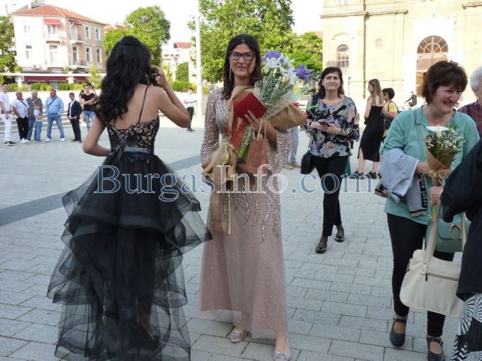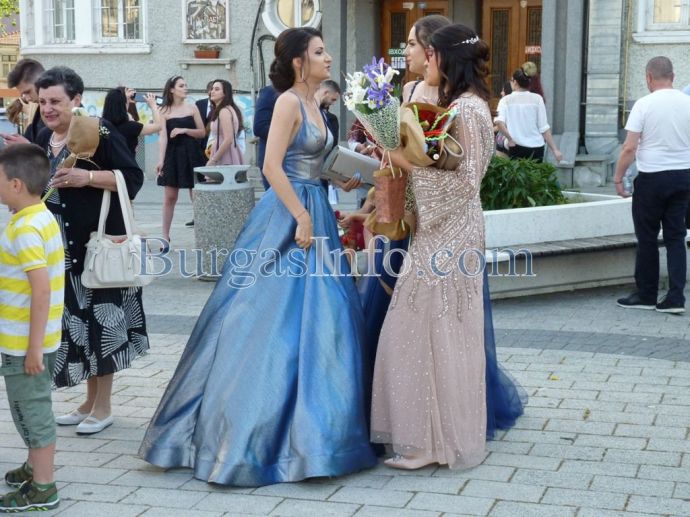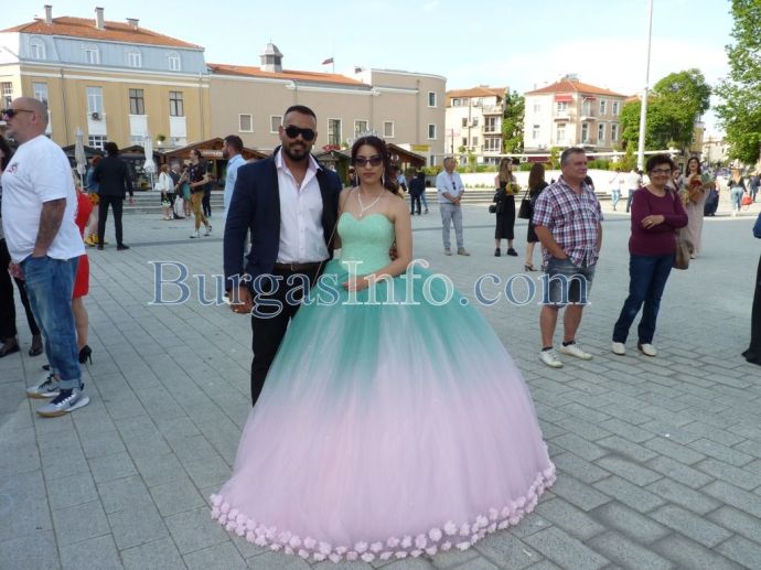 Абитуриентите от СУ „Св. св. Кирил и Методий” в Бургас изпълниха площада пред училището с цвят и блясък. Един от най-привличащите вниманието тоалети бе на Петя Маркова, която завършва паралелката по литература.