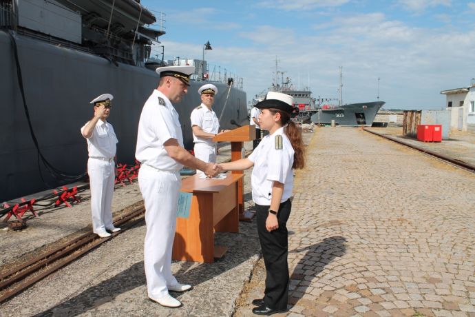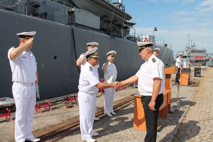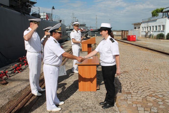 По повод празника флотилен адмирал Велков и капитан І ранг Пенев наградиха военнослужещи за отлично изпълнение на професионалните си задължения и постигнати високи резултати, а със заповед на командира на дивизиона военнослужещи от състава на формированието бяха повишени в следващо военно звание.![]()