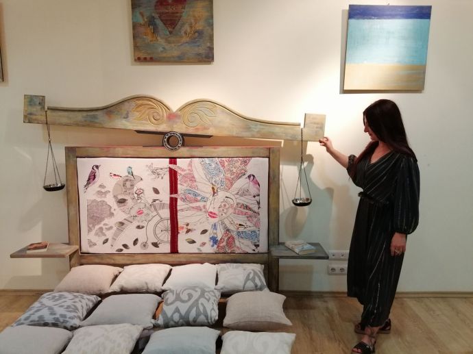 „Открих го в една много стара къща. Реставрирах го и го патинирах. Всичко тук е правено ръчно. Картините също са 20, като идеята ми за тях беше да са като хайку откровение, исках да бъдат леки, непретенциозни”, обясни Надежда Шурелова.