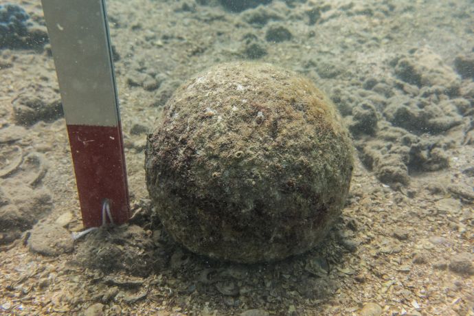Друг предмет, на който археолозите обръщат особено внимание е каменна бойна топка, извадена от водата в края на подводния риф. Тя е част от колективна находка от сходни предмети, които се събират от предходния археологически сезон. Топката тежи 8,6 кг и е с диаметър 18 см. В античния свят са познати редица случаи, при които в армейските контингенти има специални войници, които мятат каменни ядра и такива, които използват обсадни машини, изстрелващи по-тежките камъни. Смята се, че първообраза на тези машини бил изобретен през 399 г. пр. Хр.