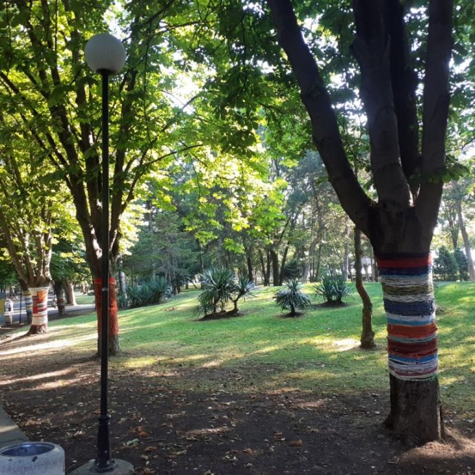 С плетки от рециклирани дрехи доброволците облякоха част от дърветата по алеята от Пантеона към Експозиционен център "Флора" в Приморски парк.