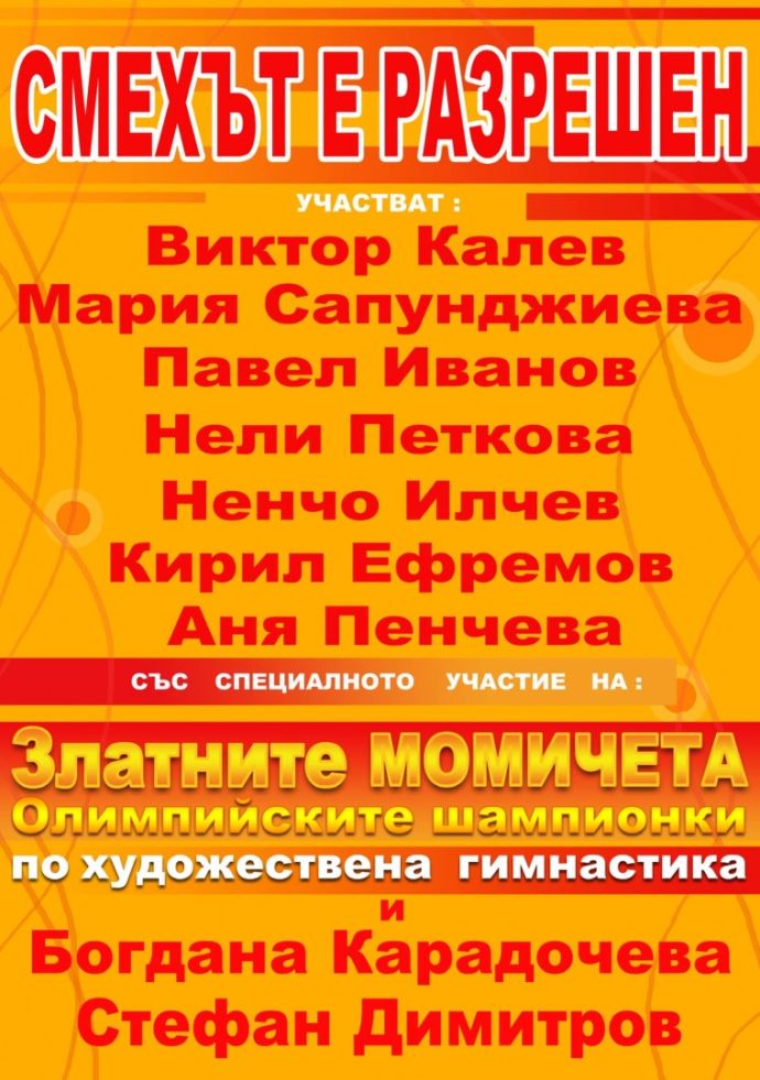 Културна организация „Арт ателие” и ПК „Ажур Пико” представят националната премиера на комедийното мега шоу „Смехът е разрешен”. Представлението ще се играе на 26-и август от 20.30ч. на сцената на Летен театър Бургас. На сцената ще видим: Виктор Калев, Аня Пенчева, Ненчо Илчев, Мария Сапунджиева, Кирил Ефремов и Павел Иванов. Със специалното участие на златните момичета от ансамбъла по художествена гимнастика-олимпийските медалистки.