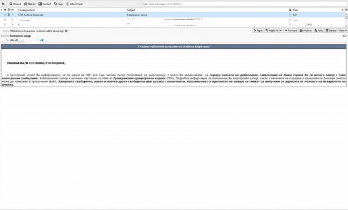 Писмата приканват получателите им да отворят прикачен файл, в който има информация за „наложения електронен запор, както и начините на плащане и конкретните банкови сметки“.