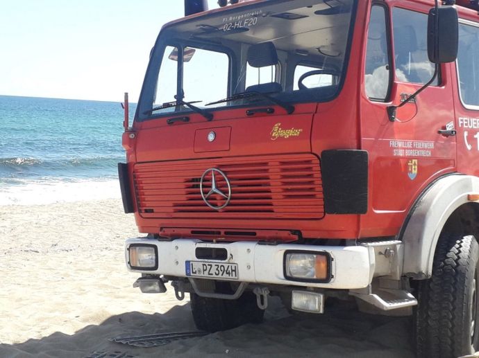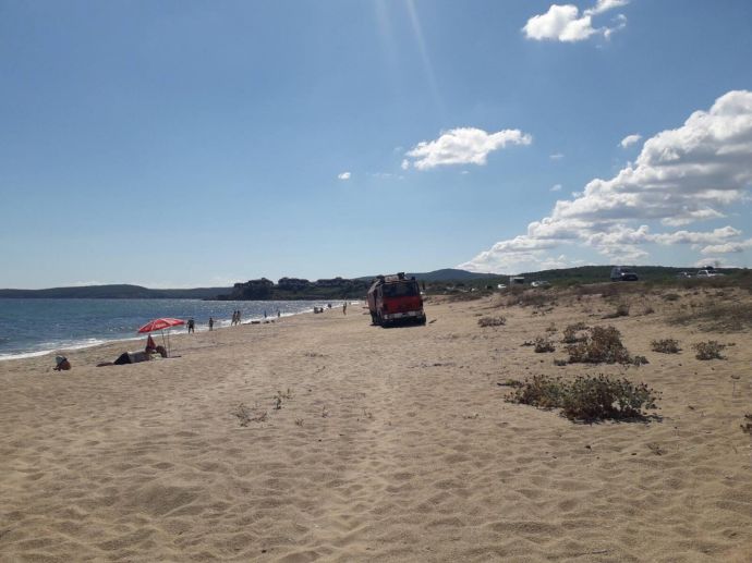 Бракуван противопожарен автомобил, превърнат в кемпер, гази Шофьорския плаж в момента, съобщиха очевидци. Червеното возило събра погледите на хората, като напълно необезпокоявано се движи по ивицата, оставяйки дълбоки в пясъка. Автомобилът е с немска регистрация.